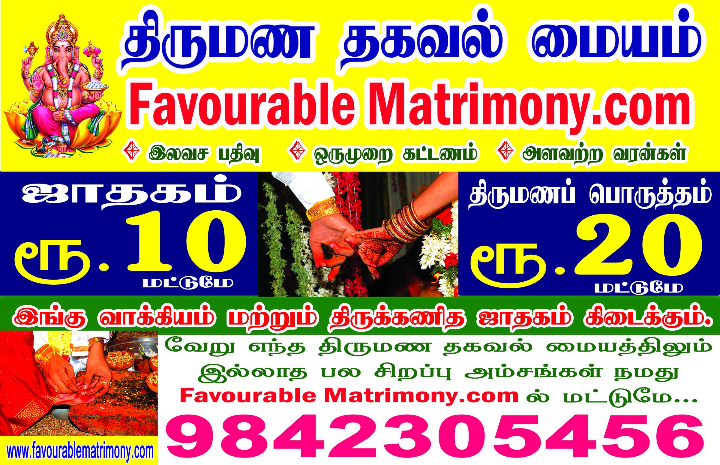 இணையதள திருமண தகவல் மையம் குறைந்த செலவில் நிறைந்த பயன் திருமணம் முடியும் வரை ஒரு முறை கட்டணம். (Awareness matrimony) வரன் முடிந்தவுடன் எங்களுக்கு தெரியபடுத்தவும்.